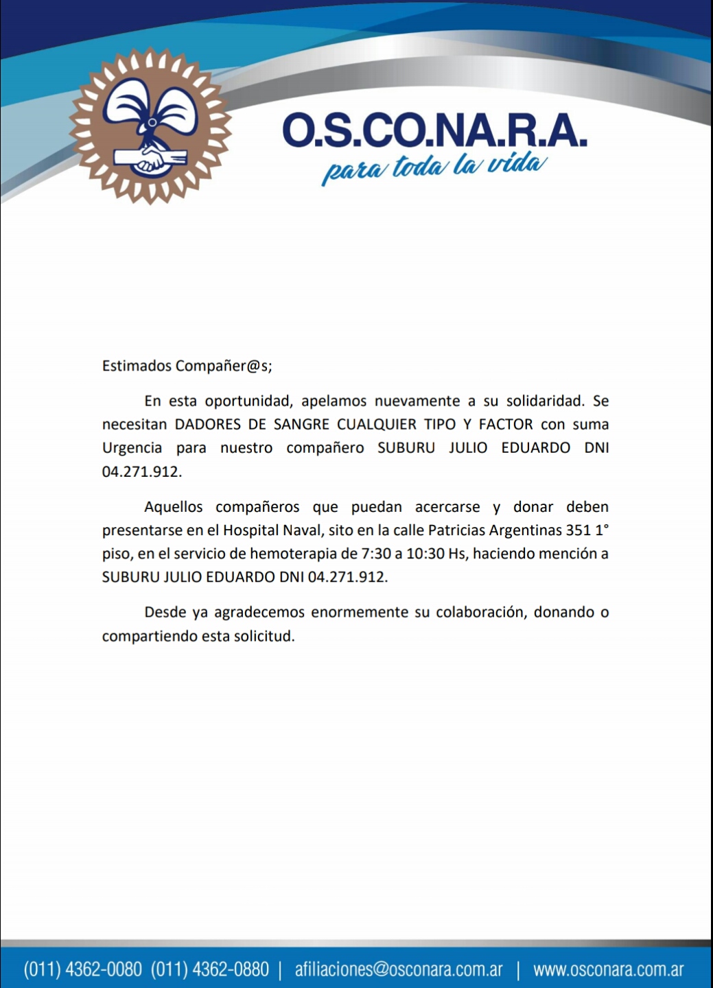 Apelamos a la solidaridad de los compañeros a fin puedan donar sangre para nuestro afiliado SUBURU JULIO EDUARDO. Por favor compartir.